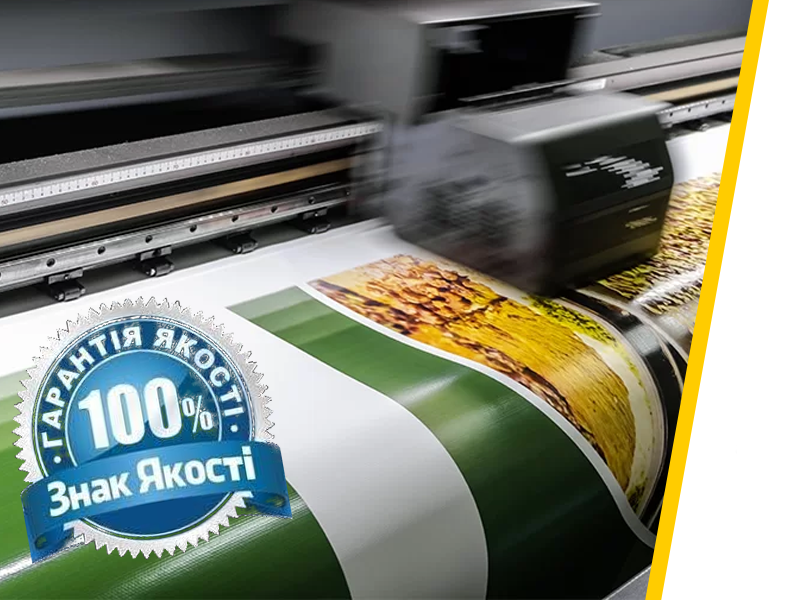 Широкоформатний друк – друк з високим розширенням, що здійснюється спеціальними широкоформатними принтерами і плотерами на рулонних матеріалах. сольвентний — друк сольвентними фарбами забезпечує високу стійкість до погодних умов та стирання. Термін експлуатації до 3 років. Застосовують його в усій зовнішній рекламі. екосольвентний — переважно використовують в інтер’єрах у зображеннях з високою деталізацією. Крапля фарби менша, ніж у сольвентномудруці, що забезпечує високу чіткість та якість друку. Латексний – це нова технологія, що кардинально відрізняється відсольвентного чи екосольвентного друку.Латексні чорнила не виділяють шкідливих речовин та не пошкоджують (роз’їдають) матеріал, оскіль кивиготовлені на основі води, а не розчинників, саме тому вважаються найбільш екологічними на поліграфічномуринку.Латексні чорнила абсолютно не виділяють запаху, тому рекомендуються для дитячих приміщень та медичних закладів. Готові вироби (наклейки, банери, плівка) – віддаються у рулоні. При потребі, як додаткову послуга, наклейки можуть бути порізан в потрібний розмір (стікерпак) Матеріали: Банер – міцний, гнучкий, еластичний та прорезинений матеріал білого кольору. Цей матеріал не боїться перепадів температури, опадів і УФ променів. Призначений для одностороннього друку. Банер, в залежності від щільності та призначення, може бути: Литий— розрахований на довгосторокове використання, має більш високий показник міцності, легко транспортується та монтується. Дорожчий за ламінований, але виправдовує це значно довшим терміном експлуатації. Ламінований— має меншу щільність в порівнянні з литим та відрізняється своєю структурою. Для кріплення використовуються люверси (металеві кільця). Самоклеюча плівка Оracal – один із найпопулярніших носіїв для широкоформатного друку. Плівки мають надзвичайно широкий спектр використання: оформлення приміщень, вітрин, вікон та вивісок; виготовлення інформаційних вказівників, штендерів, кутків споживача; для тюнінгу автомобілів та розміщення рекламної інформації на міському транспорті. Торгова марка Oracal чи не першою почала реалізовувати в Україні свою плівку. Через це будь-яку «самоклейку», зазвичай, називають Оracal. Плівка може бути матовою або глянцевою, з ламінацією чи без. Плівка One Way Vision – перфорована плівка, призначена для поклейки вікон транспорту та вітрин магазинів. Має високу світлопропускну здатність. Зображення плівки One Way Vision дуже добре сприймається з одного боку, а зі зворотнього – видно чорнусітку з круглими отворами, на якій людське око не фокусується. Таким чином створюється ефект легкого тонування. Постерний папір Блюбек — водостійкий папір з блакитним зворотнім боком — це  основний матеріал для заповнення площин білбордів. Термін використання постерів, надрукованих на блюбеку, 1-2 місяці. Стандартна щільність – 115 г/м.кв. Також підійде для виготовлення бюджетних афіш та плакатів для короткотривалого використання. Сітка «Mesh» — легкий матеріал, що пропускає 70% світла та стійкий до несприятливих природних умов. Ці характеристики дозволяють використовувати банерну сітку для створення легких широкоформатних полотен з візуальною невагомістю і прозорістю. Сіткою МeshPro часто декорують фасади будівель і споруд під час будівництва чи реконструкції.